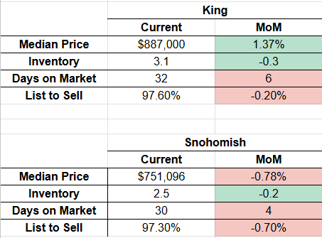 Median Price is up 1.95% in King County year over year at $887,000 and essentially flat (down 0.52%) in Snohomish County at $751,096. This is welcome news and makes the Seattle Metro market one of the strongest in the nation where other areas such as Florida, Texas and Nevada are seeing receding prices after overdevelopment.