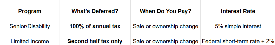 Deferrals: Delay property tax payments until the property is sold or ownership changes. Taxes accrue interest but are not due annually.